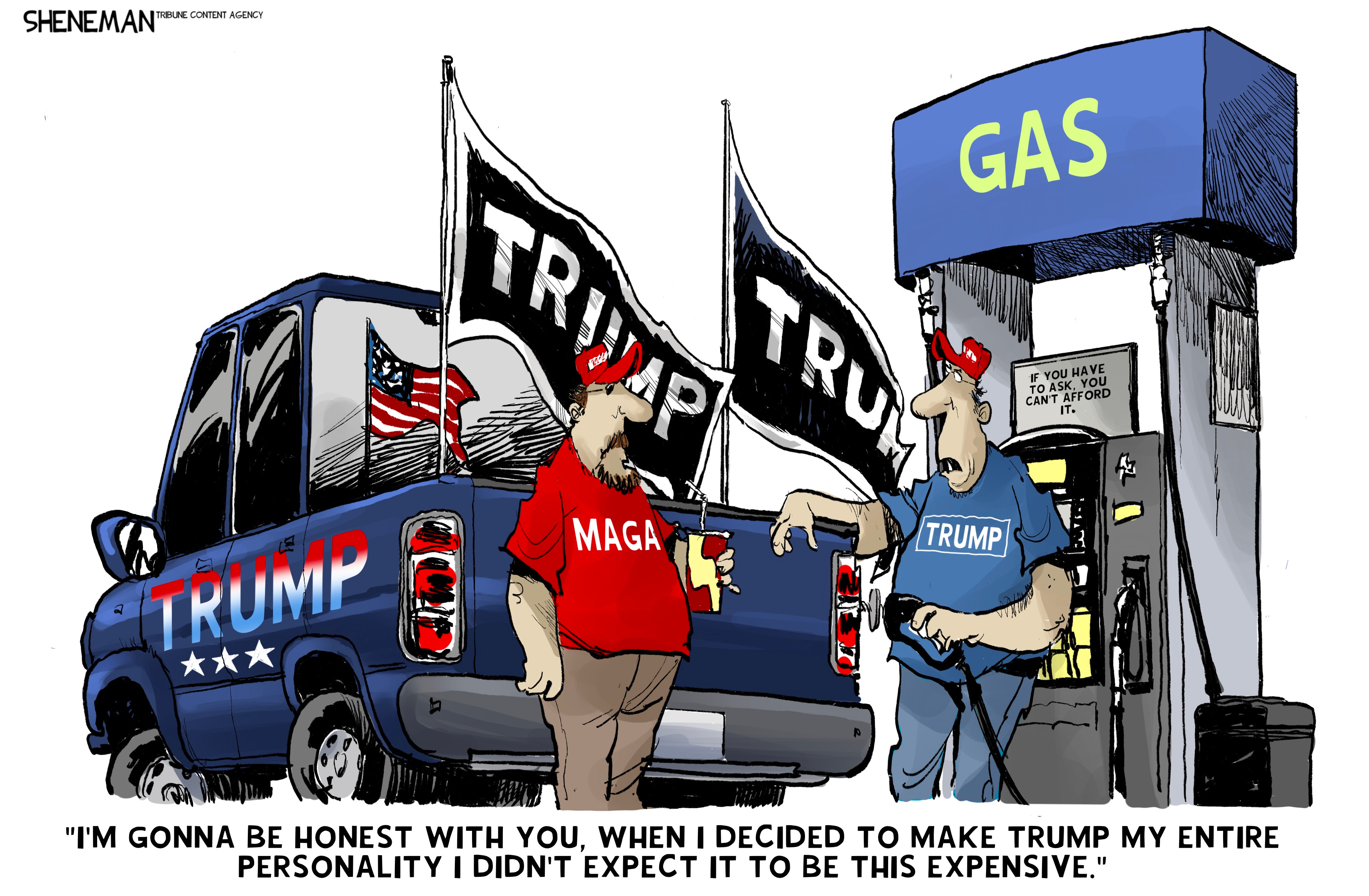 Hats, t-shirts, flags, face paint, branded bibles, bumper stickers , truck decals, gold high tops, commemorative coins, gas, eggs, diapers, ear bandages, cryptocurrency and, eventually, a criminal defense attorney…being a diehard member of the MAGA movement sure carries a lot of overhead. Not since Scientology has a cult demanded such an ongoing investment of capital to remain in good standing. At least with Scientology John Travolta sends you a Christmas card.